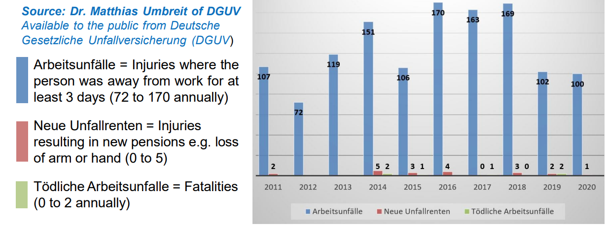 We do this job of developing standards and attending events like IRSC, because robot safety can change people’s lives if we don’t get it right. Roberta Nelson Shea, the Chief Compliance Officer for Universal Robots, shared the graph below from Germany showing the available safety data for robot incidents (unfortunately, the US data is not very complete, but is considered to be similar). The takeaway from the German data is that even as robot installations are increasing at a blistering pace, incidents appear to be going down. That is a great sign that the industry as a whole is taking safety very seriously.